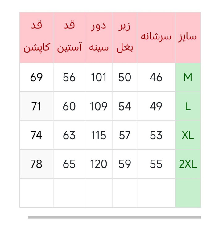 | سایز | سرشانه | زیر بغل | دور سینه | قد آستین | قد کاپشن |