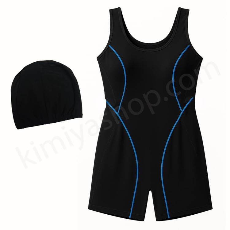 خرید اینترنتی مایو پادار زنانه مشکی لاین آبی با کلاه شنا، دوخت ایران، از جنس استرچ مایوویی ضد کلر، ضد حساسیت، با خاصیت کشسانی بالا. مناسب سایزهای 38 تا 44، بدون تغییر رنگ و بدون آبرفت.